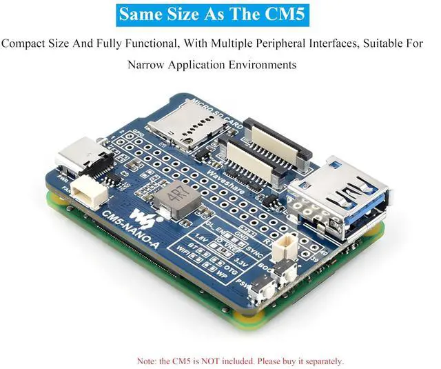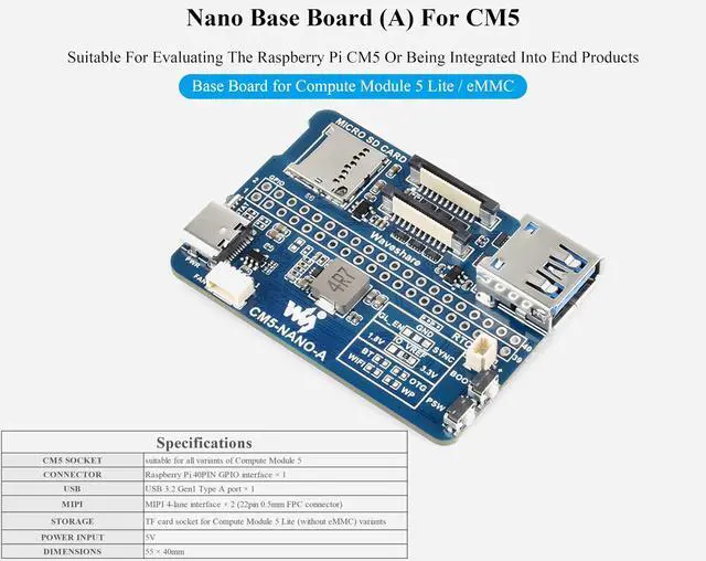 Nano Base Board (A) for Compute Module 5 Lite / eMMC Same Size As The CM5. Suitable For Evaluating The Raspberry Pi CM5 Or Being Integrated Into End Products ^^ Compact size and fully functional, With Multiple Peripheral Interfaces, Suitable for Narrow Application Environments ^^