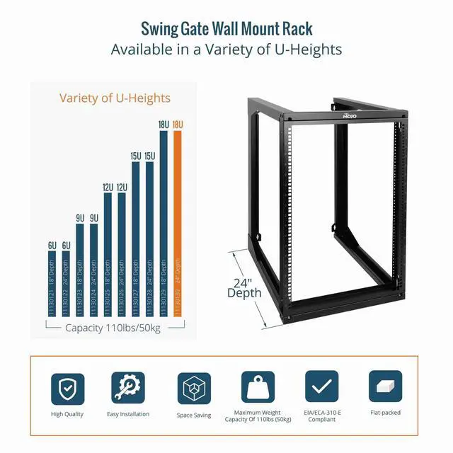 Design Features: Open Frame structure of wall mount rack, easy to move and heat dissipation; 180 degrees swing gate for rear cable access from both sides; Suitable choice of data rack and audio rack ^^