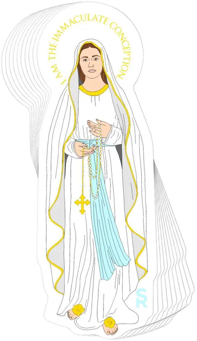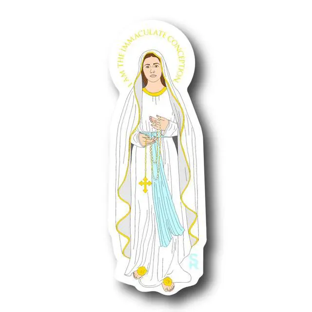 • Our Lady of Lourdes is one of the most beautiful images of Mary. Now brought to you in sticker format! Get yours today! Sticker reads, "I am Immaculate Conception!" haloing Mary's head.