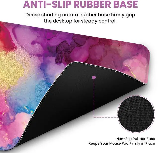 ^^ Smooth Surface for Precision The high-density woven surface delivers smooth, accurate tracking for all mouse types. This large mouse pad ensures effortless gliding and enhanced precisionperfect for both productivity and high-performance gaming. ^^ Non-Slip Rubber Base The textured natural rubber base provides a strong grip on any surface, keeping the laptop mouse pad securely in place. Whether youre working, writing, or gaming, this mouse pad for desk ensures stability and precise mouse control. ^^ Soft Natural Rubber & Durable Stitching Made from premium natural rubber with a dense, flexible foam structure, this desk pad is soft, elastic, and odor-free for long-lasting comfort.