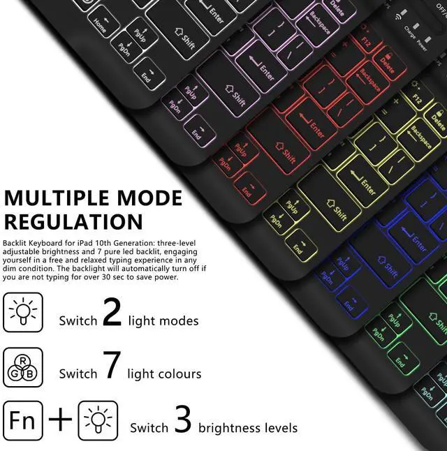 [LED Backlit Keyboard] 2 light modes (Monochromatic and gradient light), three-level adjustable brightness and 7 pure led backlit, engaging yourself in a free and relaxed typing experience in any dim condition. The backlight will automatically turn off if you are not typing for over 30 sec to save power