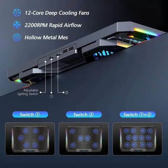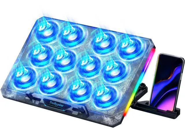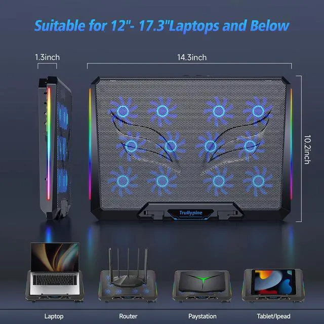 12-Core Deep Cooling FansThe Trullypine F12 Laptop Cooling Pad is equipped with 12 high-speed silent fans, providing excellent cooling effect and temperature control, 360 degrees all-round dynamic cooling; The large metal mesh provides great heat dissipation performance. Four diamond-shaped groove designs bring better heat dissipation space, being built to accelerate heat dissipation. At the same time, these high-end laptop cooling fans are all equipped with capacitor components to reduce working noise, very quiet and create a low noise environment for you! ^^ Ergonomic Design & Anti-slip BaffleEquipped with ergonomic stand and 5-level height adjustment settings, this portable laptop cooling pad helps you find the most comfortable angle for all-day use whether you're gaming, watching videos, or working.