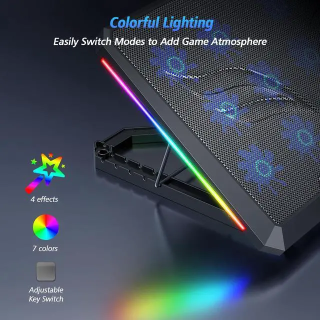 Effect ModesExclusive Surrounding LED Light: This laptop cooler has the LED glaring colorful light with several colors and three light effect modes; One button to switch, creates a cool atmosphere, light strip surrounding the laptop cooler offers visually stunning display of colors and effects, optimizing your gaming experience. (If you want to turn off the lights, just press the button 3 seconds). ^^ Two USB Ports & Cell Phone StandDual USB 2.0 Ports and power switch design, which does not occupy the laptop USB port, allows for connecting more USB devices and offers one free USB cable wire (The two USB ports are reinforced and matched with the braided wire USB cable, which will not loose or fall off easily).