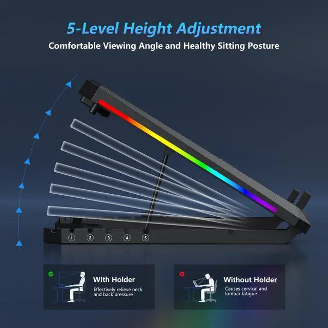 Two non-slip baffles with additional heightening pads for thicker laptops prevent sliding and provide extra stability. It's not just a laptop cooling mat, but also a perfect laptop stand. ^^ Colorful Lights 3