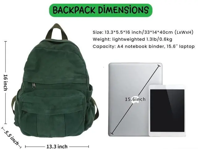 GAMLFL Green Canvas Backpack for Women Retro Aesthetic Rucksack Basic Backpack for High School/College Students Travel Laptop Bag