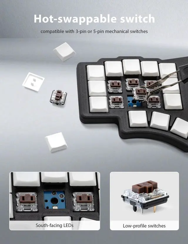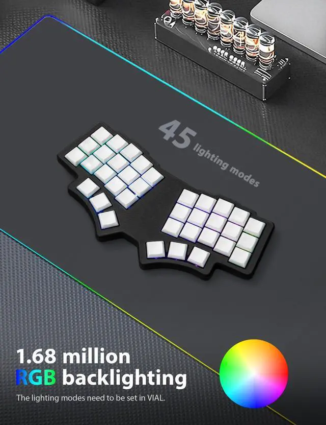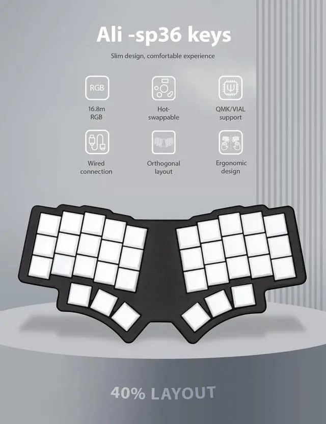 [Ergonomic Unibody Split Design] The YIVU keyboard features a monoblock split layout with a natural angled key arrangement. This columnar staggered design aligns with the natural resting position of your fingers, significantly reducing wrist strain and fatigue during long coding or typing sessions compared to traditional staggered keyboards. ^^ [Efficient 40% Compact Layout] Designed for minimalism and efficiency, this 40% form factor removes the number row and function keys, keeping your fingers closer to the home row. By utilizing layers (like holding a "Fn" key), you can access all functionalities without stretching your fingers, saving desktop space and optimizing your workflow.