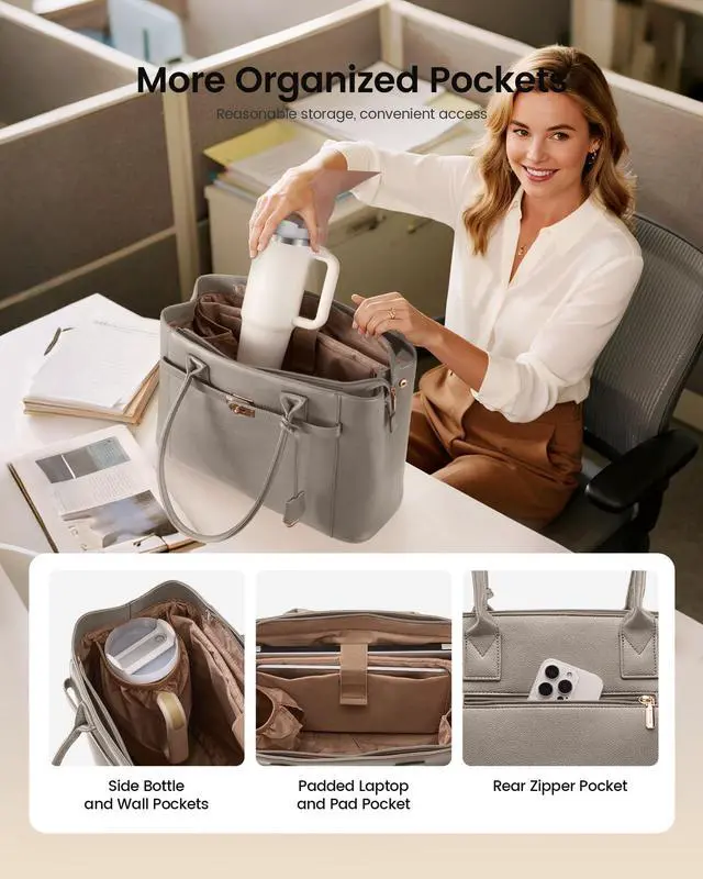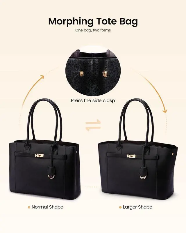 Which can easily swallow water bottles, umbrellas, notebooks, chargers, pens, and phone in dedicated homesno more black-hole bottoms. ^^ Convertible SilhouetteTwin side clasps transform the work bag in seconds: snapped shut, you get a structured square tote fits perfectly in any work office and commute scenario; unsnap for a relaxed trapezoid that expands for farmers-market hauls or overnight staystwo silhouettes, one bag, zero compromises. ^^ Semi-Structured PU LeatherThe briefcase crafted by premium PU leather rebuffs water, coffee, and scratchesjust wipe clean. Semi-rigid walls protect your tech while still flexing to accommodate bulky items like sneakers or a DSLR, bridging the gap between stiff briefcases and floppy shoppers. ^^ User-Centric DetailsExtra-thick rounded handles offer superior weight-bearing capacity compared to traditional single-layer straps. Smooth metal zippers ensure effortless gliding. 4 metal feet keep the base pristine and elevate the messenger bag off cafe floors or airport carpets.