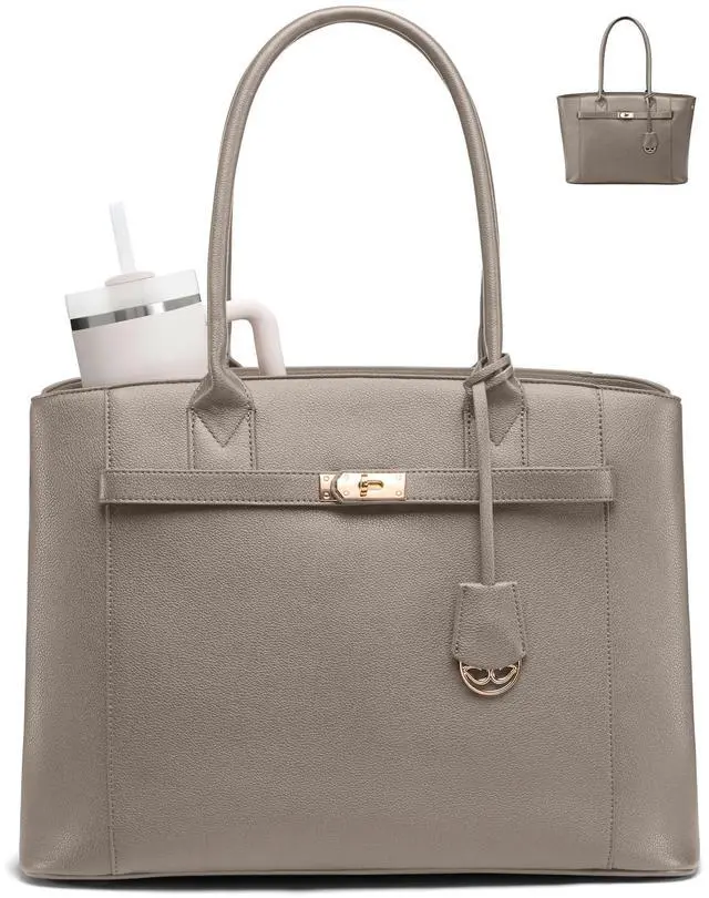 Fashion InnovationSignature cross-bar metal clasp, dangling metal logo charm, Stanley cup pocket, and convertible silhouette ^^ Dimensions 17.3" x 6.9" x 12.4". Accommodates laptops up to 17.3". ^^ Classic Meets Personal StyleClean, sleek silhouette lines of the tote bag nod to timeless tote appeal, but the horizontal cross-bar hardware and vertical logo pendant add contrast that catches light and compliments. Pair it with a tailored suit for Monday meetings or throw it over a hoodie on Sunday errandsits quiet sophistication adapts to any wardrobe and lets your personality lead. ^^ Spacious Laptop Tote BagComputer bag owns 17.3" laptop pocket + one tablet sleeve (both padded), 2 interior side pockets (one sized for Stanley), 4 different wall pockets, 1 zip security pocket, plus 1 quick-grab external zip pocket.