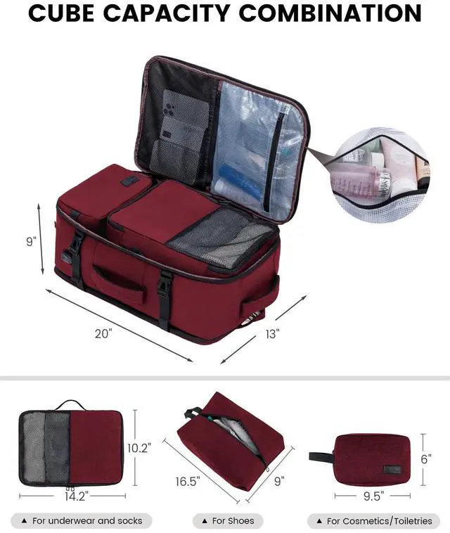 Large Capacity: This Travel backpack Has 4 extra large compartments, perfect for packing cubes, outfits, and tech gear, suitable for men and women travelers. ^^ 3 Packing CubesComes with 3 cubes for organized storage of sweaters, jackets, pants, shirts, shoes and toiletries. Crafted from water-resistant polyester, it protects your belongings in various weather conditions. ^^ Personal Item BackpackMeets airline carry-on requirements, perfect for weekend trips, college, or as a unique gift. ^^ USB Charging Port Equipped with an external USB port and internal cable for easy device charging on the move (power bank not included). ^^ Comfortable for Travel Designed with ventilated padding and adjustable straps for comfort, includes a luggage strap for easy transport.