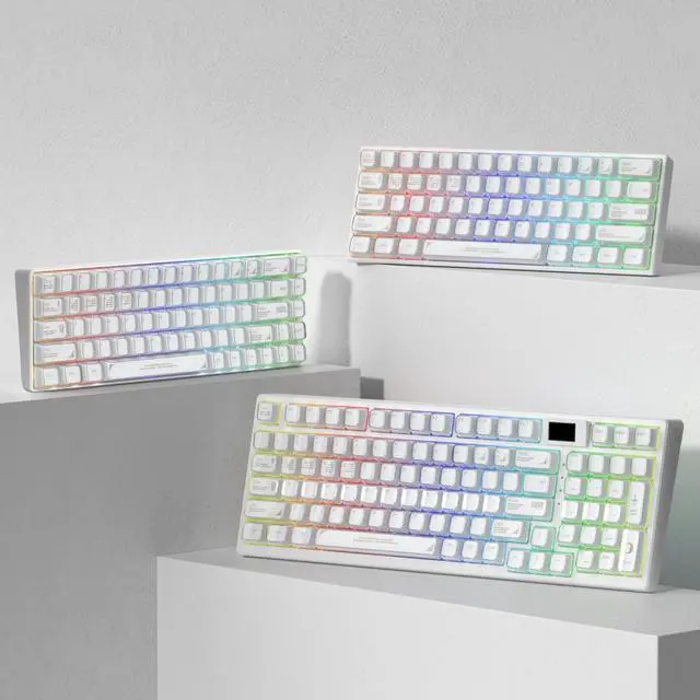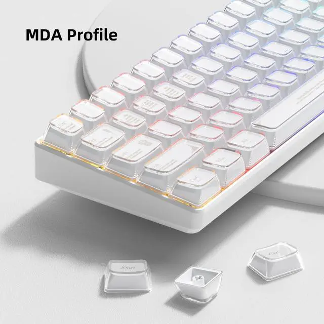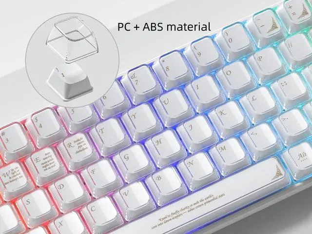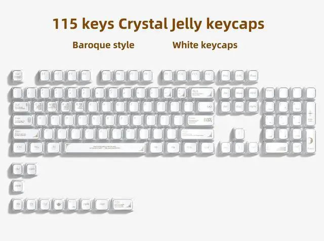 PC+ABS Mechanical keyboard Keycaps WhiteMade with an inner ABS layer for durability and an outer PC transparent layer for a crystal-clear white finish, ensuring both strength and style. ^^ High-GlossThe outer PC material has a smooth, glossy surface that enhances light reflection, giving your keyboard a sleek and premium look. ^^ Elegant Baroque DesignThese key caps feature a stunning Baroque-style theme with gold characters, adding a luxurious and vintage touch to your keyboard setup. ^^ MDA Profile key caps for ComfortDesigned with MDA height for an ergonomic typing experience, balancing comfort and responsiveness for both gaming and daily use.