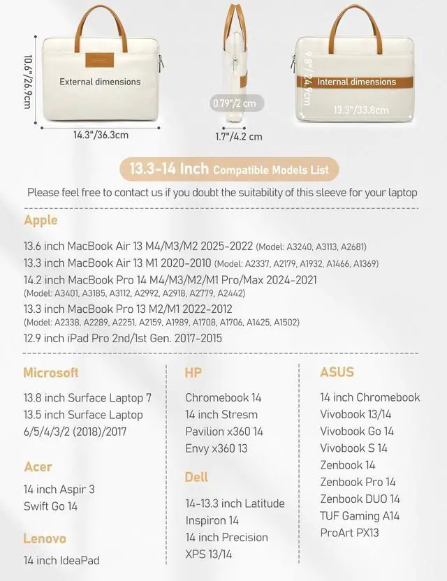 Compatibility: The inner dimensions of this sleeve are 33.3 x 24.4 cm/ 13.1 x 9.6 inches, suitable for most 14.5 -13 inch laptops such as 14 inch Acer; MacBook Pro 14; MacBook Air 13; 14 inch ASUS Chromebook; ASUS Zenbook 14; 14 inch Dell Latitude; HP Chromebook 14; HP Envy x360 13; 14 inch Lenovo IdeaPad; 13.8 inch Microsoft Surface Laptop 7; 13.5 inch Microsoft Surface Laptop 6/5/4/3/2 (2018) /2017. Please check the dimensions of your device before purchasing