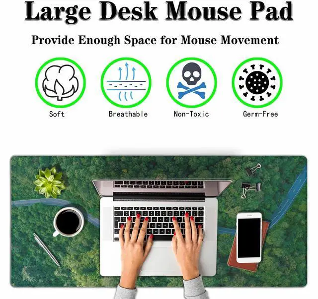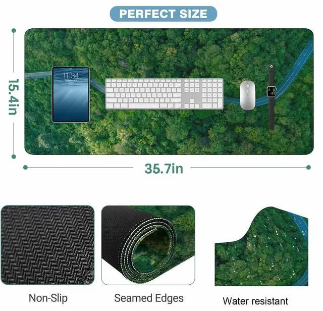 The mouse pad for desk size is 900 x 400 x 3mm ( 35.4 x 15.7 x 0.11 inch). About the package is includ one piece mouse pad, which lagre big extended size mousepadthe material is Chamfered fabric and Rubber Base. The soft and dense non-skid nature rubber base keeps the mat firmly in place, it can effectively prevent the mouse and keyboardfrom sliding and moving. suit to all types of desks including wood, glass, leather, metal, marble desk and so on. desk pad is flexibleenough to be rolled up carry, if you want to use when travel.