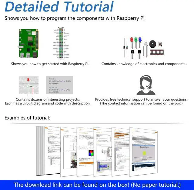Total: Provides step-by-step guide with basic electronics and components knowledge (The download link can be found on the product box) (No paper tutorial) ^^ 69 Projects from Simple to