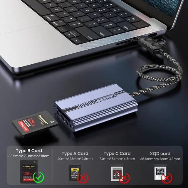 Blazing-Fast 10Gbps Transfer with Unwavering StabilityMOGOOD CFexpress Type B Card Reader offers an ultra-fast maximum transfer speed of 10Gbps (equivalent to 1250MB/s), enabling the transfer of your work in just a matter of seconds. This not only supercharges your work efficiency but also guarantees a stable and reliable transfer process. ^^ USB-C/USB-A Type B CFexpress AdapterMOGOOD Type B CFexpress Card Reader is highly portable and compatible. It works with PC, MacBook, iPad, iPhone and USB-C/USB-A devices. Its compact design and long cable allow effortless use with desktops and laptops, facilitating your work anytime.