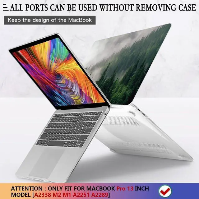 Release Models: A2159/A1989/A1706 and old Macbook Pro 13 A1502 A1425 A1278 and other Air13/Air 13.6 /Pro14 size. Please kindly check the model number "Axxxx" on the bottom of the MacBook before your purchase, make sure youre ordering the correct size"A2338""A2289"or"A2251". ^^ [Pretty Case, Logo No See Through Design] 13-inch (diagonal length) hard shell cover. Unique 3D UV 4-layer process printing technology, beautiful case of individuality, Well-printed unique Green Forest stylish design on a hard plastic case with soft touch texture. Logo no cut out design, artistic surface of the laptop that also makes your gray, silver MacBook pro out of the ordinary. ^^ Snap on [also firmly clip on] and Two pieces (the top and bottom case separated) design, easy to clip on and take off, let you open/close your MacBook freely all the time. Precise Cut out design, Thunderbolt port access, also access to all ports without removing the case. Bottom cover with vent slots to heat dissipation and 4 raised rubberized feet to keep your laptop firmly on the place. ^^ [4in1 Bundle