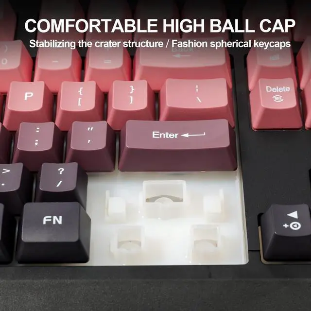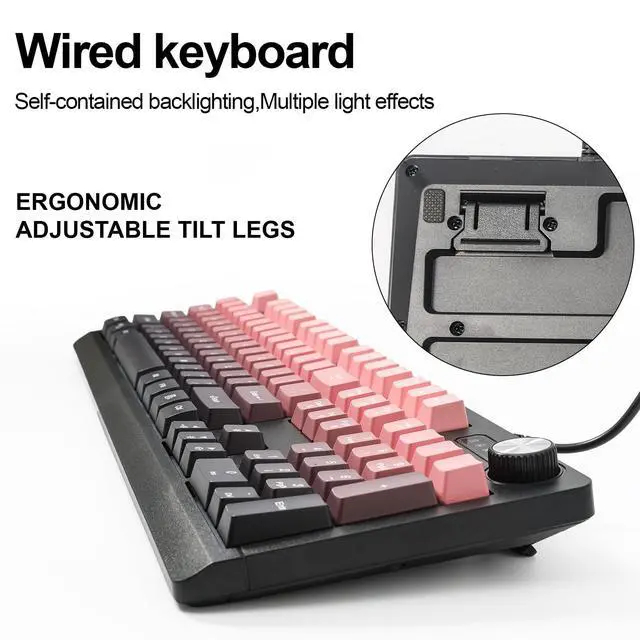 Knob Design Keyboardfor both office and gaming use. The knob adds more controllable functions to the keyboard, and the USB connection ensures no delay and no interruption to gaming progress. ^^ Gradient Keycapsmake the keyboard look great even under natural light without the backlight. ^^ Soft and Comfortable CaseAdjustments to the keyboard's bottom design ensure a responsive state during gaming. ^^ Lightweight and PortableWe optimized the keyboard's internal structure to minimize weight while maintaining durability, making it more convenient for travel. ^^ RGB Keyboard8 kinds backlight, 4 kinds stream light, 5 levels of brightness to adjust, compair different games you choose.