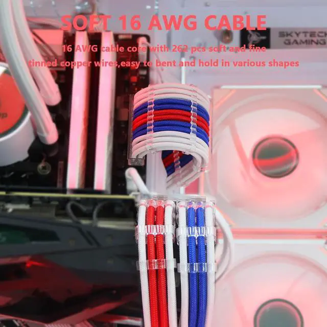 Sirlyr PSU Cable Extension,Customed Pre-Bend PC Power Supply Cable,1x 24 Pin ATX / 1x 8 (4+4) Pin EPS/Longer 2X 8 (6+2) Gold-Plated Pin Pcie,Nylon Sleeved White Red Blue,4 Kits