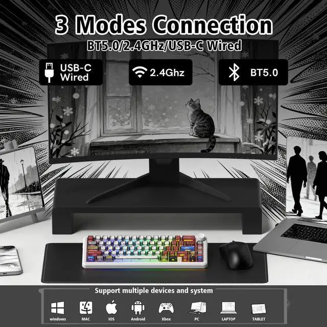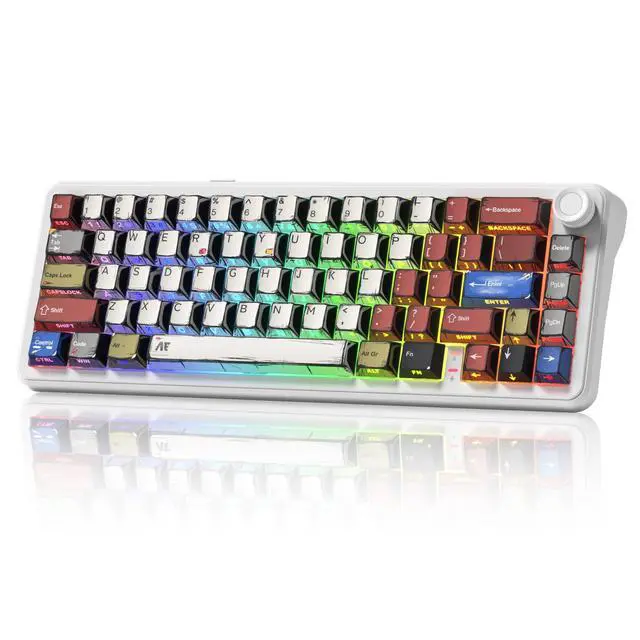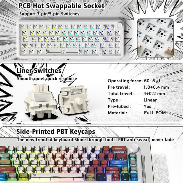^^ Hot Swappable Socket Custom KeyboardThis wireless mechanical keyboard comes with linear switch, pre-lubed finely-calibrated stabilizer, and 1.2 mm single key slotted PCB, better optimizes resilience and stability, making the typing feel softer and more elastic, allowing full key hot swap with most 3/5 pin switches without soldering to freely customize your keyboard and enjoy the process of building your unique setup. ^^ South-facing RGB Backlight&Shine Throug PBT KeycapsThis light up gaming keyboard can offer a preset 18 dynamic chroma backlit modes, 7 monochroma and 1 rainbow color light, effectively enhance your music or game world with cool groovy lighting effects, matched with double shot shine through anime theme cherry profile keycaps, which provide aesthetic appearance, lasting clear characters and ergonomic typing feeling, integrated beauty and practicality.