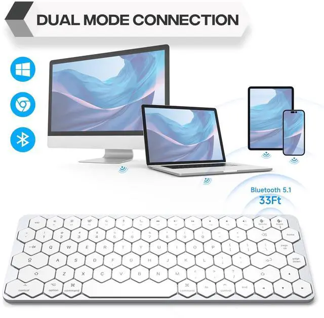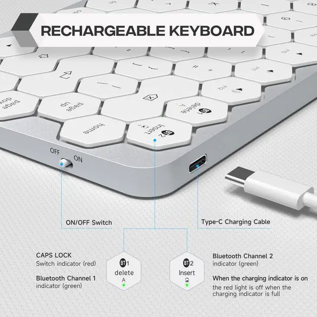 Hexagon Keycaps Design- Enjoy the ultimate in portability and space-saving convenience with our mini Bluetooth keyboard featuring hexagon keycaps.