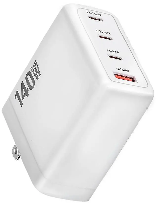 140W Hyper-Fast Charging PD 3.1 Connect a single device to get a 140W max chargethats enough to power up the 14" MacBook Pro (M3 Pro) to 50% within 30 Minutes. And when you connect four devices simultaneously, power will be distributed efficiently between ports to ensure you get the best charge. ^^ 4-in-1 Fast Charger Featuring 2 USB-C (140W PD), 1 USB-C (30W PD) and 1 USB-A ( 22.5W QC) ports, the wall charger delivers a total output of 140W Max, enabling fast charging of up to four devices simultaneously with efficient power distribution.