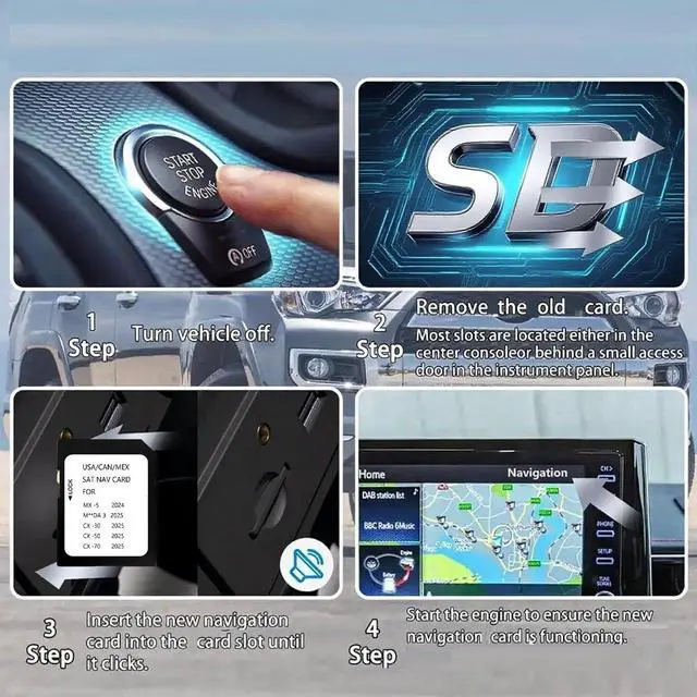 INSTALLATION INSTRUCTIONStep 1: Turn vehicle off. Step 2: Locate the card slot. Step 3: Remove the old memory card. Step 4: Insert the new Navigation memory Card into the slot until it clicks. Step 5: Start the engine to ensure the new Navigation memory Card is functio