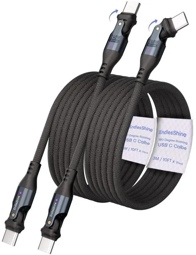 new practical design: 180 rotating head, When charging with the thunderbolt 3 cable, it also allows us to find a comfortable handheld device method for gaming/phone/chat/entertainment, etc. Android usbc to usbc cable completely solves the trouble of ordinary wires that tend to block the hands & unintentionally interrupt & when used during charging. Solves the problem of frequent bending leading to fast charging cord type c for breakage. ^^ Useful TipsThe USB adapter complies with the USB 2.0 data transfer standard. But Video in/out is not supported. It is not recommended to connect a USB C hub. ^^ Durableright angle USB C cable 180 degree rotating head design combined with high grade nylon braided cable manufacturing, which lasts longer than ordinary cables under the right usagel. Nylon-Braided Cords is through 40, 000+ bending life tests, it is proved that the nylon braided fiber can protect the charging cable very well. Thunderbolt 4 cable used for travel, beds, sofas, car charger & other places. cable tipo C LED design allows us to find cables faster in the dark. ^^ What You Get2 pcs long USB C cable 10FT, USB C to C cable is compatible with all