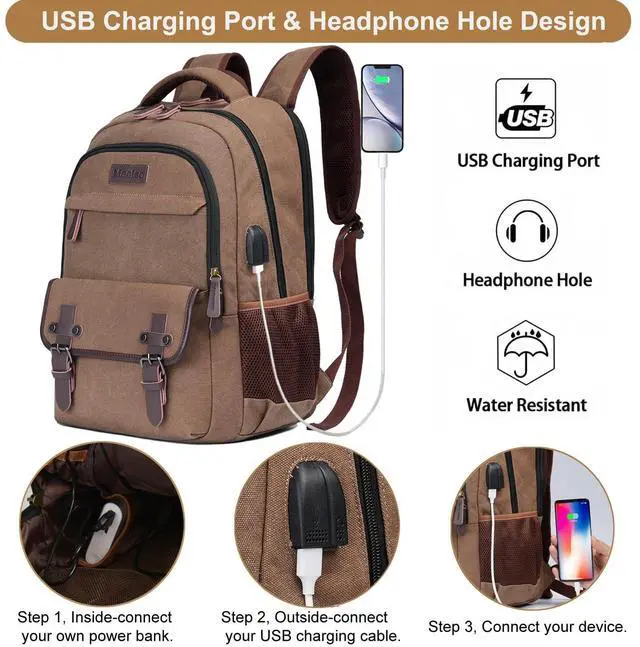 Headphone Port: This laptop backpack has external USB port with built-in charging cable offers convenient charging your cellphone by connecting your own power bank. The headphone port outside gives easy access to Earphone usage as well. (battery pack NOT included).