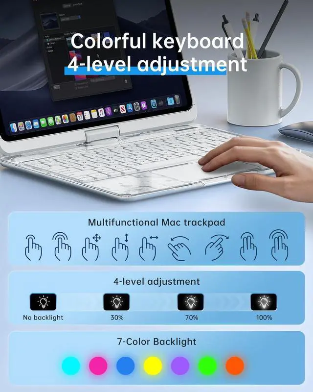 Case: Illuminate your workspace with 7 vibrant colors and 3 brightness levels. This for iPad Pro 11 inch case with keyboard offers exceptional typing comfort in low-light environments, making it perfect for nighttime work or travel. ^^ Multi-Touch Trackpad & 360