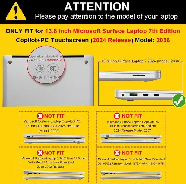 • Specifically designed for 13.8 inch Microsoft Surface Laptop (7th Edition) Windows 11 Copilot+ PC Touchscreen Display 2024. (Model: 2036). Please check the back of the laptop for the exact model number.