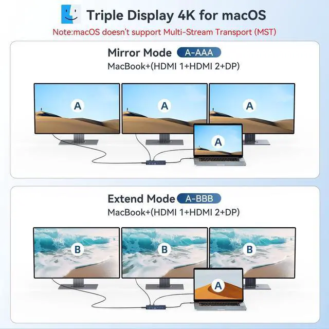 USB C Docking Station: ANYOYO USB C Docking Station Dual Monitor could extend your laptop from USB C/thunderbolt 3/4 to a 14-port workstation, with 2*4K HDMI DP Display Ports 3*10Gbps USB C 3.1, 2*10Gbps USB A 3.1, 1xUSB 2.0, SD/TF card reader, 1000Mbps Ethernet, 3.5 mm audio and microphone, and PD 100W charging, NOTE: Not all USB-C device is compatible with the hub, the incompatible device cannot use the HDMI or DP of this dock. And all external monitor images are the same on Mac OS. due to Mac OS system limit ^^ Laptop Docking Station 3 MonitorsThis USB C docking station support dual monitors and triple displays for Windows While single 4K@60Hz display and triple 4K@30Hz displays(under DP 1.4 ). ONLY Windows system support MST and SST(Mirror & Extend Mode). MacOS system DOES NOT Support MST ^^ Up to 10Gbps Super