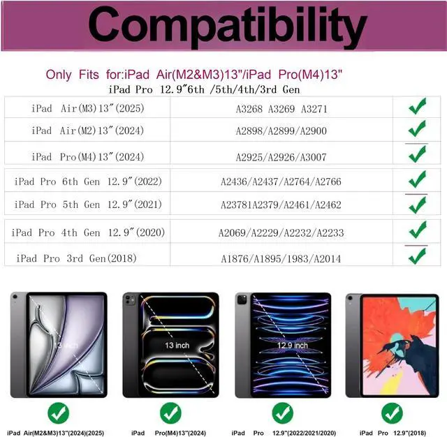 Pro (M4) 13" (2024): A2925/A2926/A3007 iPad Pro 6th Gen 12.9" (2022) A2436/A2437/A2764/A2766 iPad Pro 5th Gen 12.9" (2021) A2378/A2379/A2461/A2462 iPad Pro 4th Gen 12.9" (2020) A2069/A2229/A2232/A2233 iPad Pro 3rd Gen 12.9" (2018) A1876/A2014/A1895/A1983 Not compatible with any other model. ^^ ipad pro 13 inch case 2024Case LIGHT AND DURABLE-Constructed from High-quality shock-absorbing EVA material, avoid bumps, drops, dust, and scratches from damaging your tablet. ^^ Functional Double Kickstands Built-in 2 Foldable Kickstands can stand up your ipad PRO 12.9 INCH on the desk for hands-free horizontal viewing angle or typing position. ^^ PRECISE OPENINGS-You can perfectly access all the functions of your iPad Air 13 Inch 2024 tablet, gives easy access to charger port, speakers, cameras and power buttons. NO need to remove the case for charging or taking photos. ^^ Kids Friendly KYWYNI ipad PRO 13 INCH case features a handle stand design with flip functionality, it provides dual viewing angles, allowing children to easily watch videos, play games, or drawing. Additionally, it ensures a secure grip, preventing accidental drops.