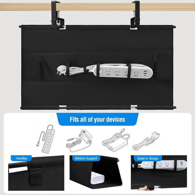 Easily group, separate, and secure cords to prevent tangling and simplify identification whenever you need to adjust your electronic setup ^^ Durable Build & Reliable Support - Featuring a reinforced base and robust clamping system, this tray offers exceptional stability for your essential devices. The tough 600D Oxford material maintains its form, providing long-lasting organization for power strips and multiple adapters ^^ Versatile for Any Workspace - Ideal for organizing cables in home offices, gaming desks, and study areas. This tray effectively secures loose wires to minimize tripping risks and contributes to a safer, more orderly environment for both work and leisure activities (Note: Clamp mounting requires 4 inches of clear desk edge space)