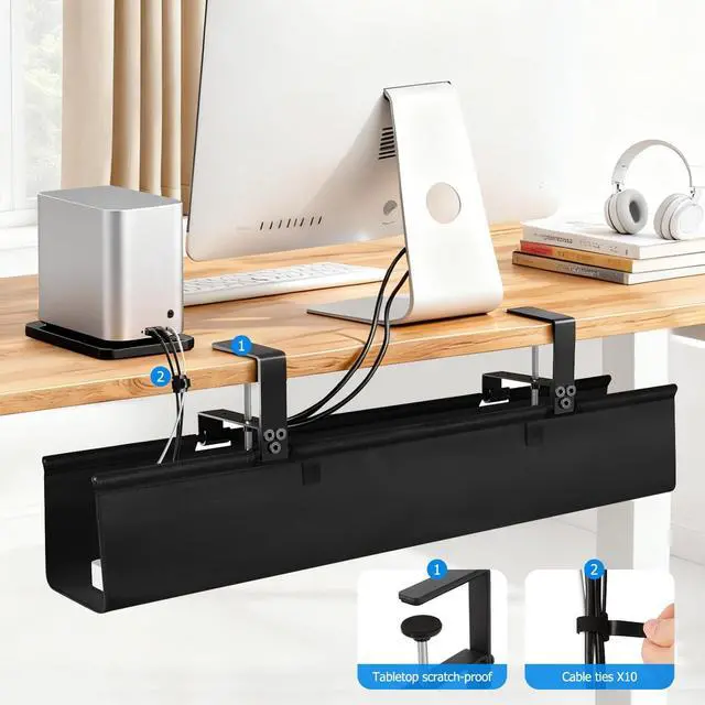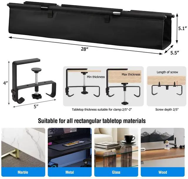 Spacious & Fully Concealed Design - This 28-inch under desk cable tray provides generous capacity to neatly store and conceal all power strips, bulky adapters, and tangled wires. The premium fabric cover instantly transforms cable chaos into a tidy workspace, promoting cleaner aesthetics and improved focusno more visual clutte ^^ Secure Dual Mounting System - Features a versatile installation with both a heavy-duty clamp (including protective pads for scratch-free use) and a screw-in mounting option. Engineered to grip desks securely up to 2.0 inches thick, this tray stays firmly in place on wood, glass, or metal surfaces ^^ Effortless Cable Organization - Designed with a quick-fold opening and integrated cable ties for straightforward wire management.