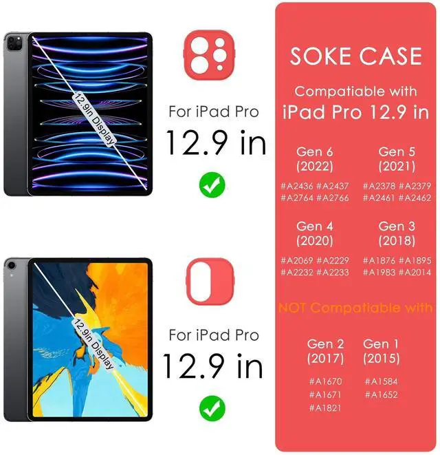 • [For iPad Pro 12.9"] - Exclusively designed for Apple iPad Pro 12.9" 2022 6th Generation(A2436 / A2764 / A2437 / A2766); 2021 5th Gen (A2378 / A2461 / A2379 / A2462); 4th Gen 2020 (A2229 / A2069 / A2232 / A2233); 3rd Gen 2018 (A1876 / A2014 / A1895 / A1983)