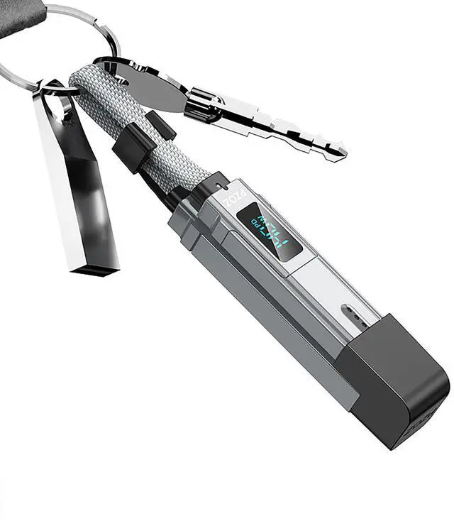 Keychain Charger 7.3 inch length ultra lightweight design, integrating Lightning, USB-C, and USB charger cable together, portable and easy to use. The cap design allows you to easily snap the heads together and hang it on your keyring or bag. ^^ 5-in-1 & LED Display and Micro SD Card Reader The design concept of PZOZ simplifies your life. It combines four ports, LED display and TF card reader into one cable. USB A to C, USB A to Lightning, USB C to Lightning, and USB C to USB C.