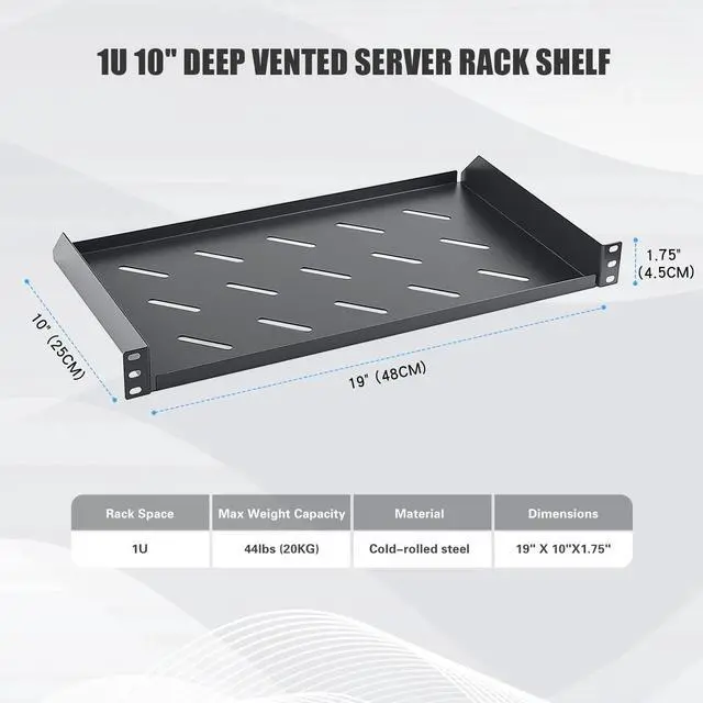 UNIVERSAL 19" FIT: The 1U server rack shelf is suitable for all 19 inch equipment Rack and Cabinet, can accommodate an internal depth of 10 inches (25cm), shelving for IT, data network and stereo equipment.