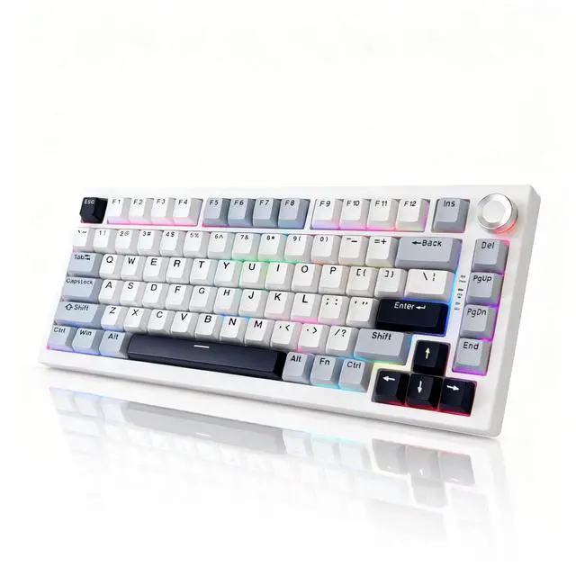 Ergonomic Keyboard & Gasket Flexible Structure As an ergonomic keyboard, the K81 employs a flexible gasket structure. Its internal independent support and soft, springy feedback deliver smoother, gentler keystrokes, alleviating finger fatigue from prolonged typing. A multi-layer noise reduction structure (IXPE switch pads, PET sound dampening pads, and bottom buffer layer) effectively minimizes resonance and noise. The 2-centimeter low-profile front edge and two-stage adjustable stand maintain a more natural, relaxed wrist position, ensuring comfort even during extended use. ^^ 3.16 Million Color RGB Backlight & 75% Compact Layout K81 as PC gaming keyboard featuring 1600 soft-glow RGB LEDs with support for up to 15 lighting modes.