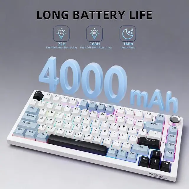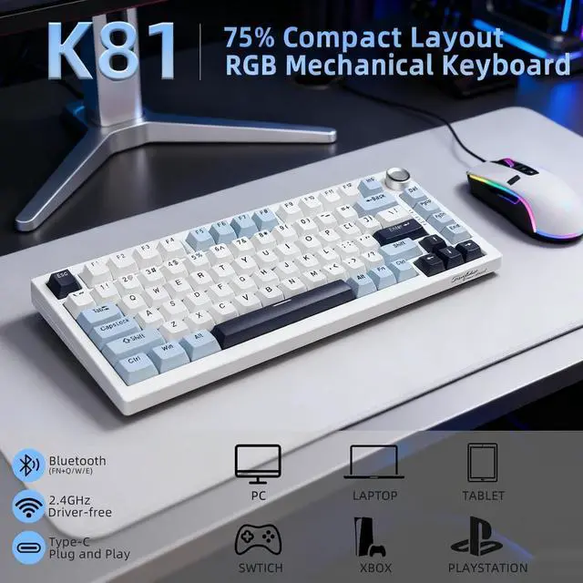 1Wireless Keyboard with Triple-Mode Connectivity & Equipped with a 4000mAh/8000mAh battery The K81 wireless keyboard supporting Bluetooth, 2.4G wireless, and Type-C wired triple-mode connectivity. Whether for daily office work, entertainment, or switching between multiple devices, it delivers a stable and smooth input experience. To accommodate different usage preferences, the Bright white variants feature a 4000mAh battery, The Abyssal Black models upgrade to an 8000mAh battery, ideal for extended usage scenarios. This keyboard seamlessly works with computers, tablets, and smartphones, supporting multi-platform workflows. ^^ 2.