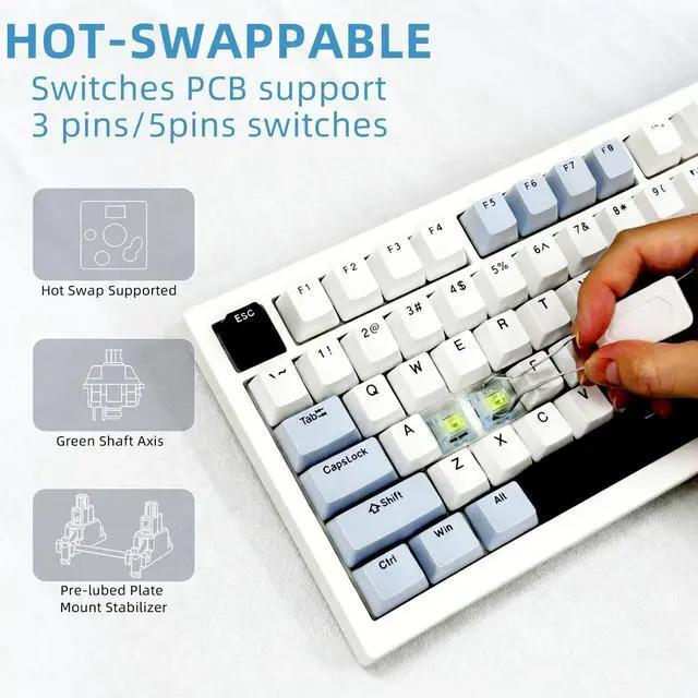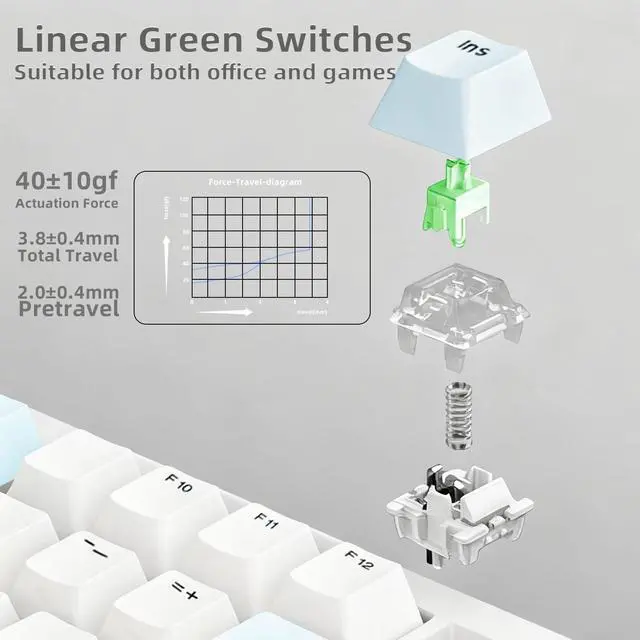 Customizable brightness and speed settings effortlessly create an immersive desktop visual experience. Its 75% compact layout retains all essential keys while significantly saving desk space, delivering a more efficient control experience for gaming, office work, and content creation. ^^ 4. Wireless Gaming Keyboard PBT Keycaps & Mechanical Switch Experience As a durable and stable wireless gaming keyboard, the K81 features high-quality PBT keycaps that resist staining and fading over extended use, delivering a dry and smooth tactile feel. The Bright white variants feature smooth linear Green Turf Switches V 6.0 for light, fluid actuation; Abyssal Black models come with White Horse Switches V 6.0 delivering solid, consistent feedback.