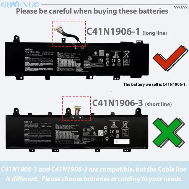 Battery Condition: 100% brand New from Manufacturer. ^^ Compatible Model For ASUS TUF Gaming A15 FA506II FA506IU FA506IV series, ASUS TUF Gaming A15 FA506QR 2021 series, ASUS TUF Gaming F15 FX506H FX506HC FX506HM FX506LH FX506LI FX506IV FX566IV series, ASUS TUF Gaming A17 FA706II FA706IH FA706IU FA706QR series ^^ Compatible Part No# C41N1906-1 B0B200-03620000 0B200-03590000 4ICP5/63/133. ^^ Quality First We have passed a series tests of short circuit, overheating, and overload protection before shipments. The newest generation chips, grade A cell battery, provide long cycle life, stable performance and broad compatibility. ^^ Service First-rate We promise 30-Day Refund & 1-Year Warranty. For any battery questions, just feel free to contact us for help via the order or click on"GBNENGTD", then you can see "Ask a question" on the page. We are here to serve for you for any battery problems within 24 hours.