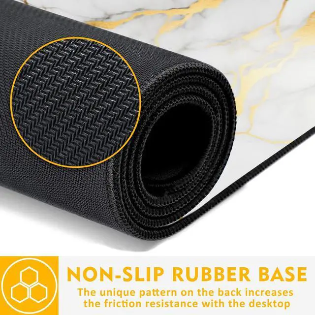 Easy cleaning and maintenance. ^^ Durable Stitched EdgesThe edge locking design tackles common issues like desk mat edge wear, deformation, and de-gluing, ensuring a more substantial and durable product. Roll it up, toss it in your bag no worries about warping. The cutting-edge stitching technology guarantees that the mouse pad won't wear out or deform during use. The stitched frame adds an extra layer of durability, preventing it from wearing out or coming apart like other mouse pads. ^^ Non-slip Rubber BaseThe soft and flexible non-slip rubber bottom provides increased friction resistance, keeping the desk pad securely in place on your desktop.