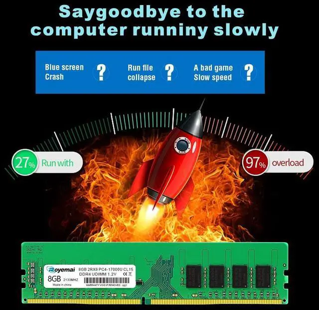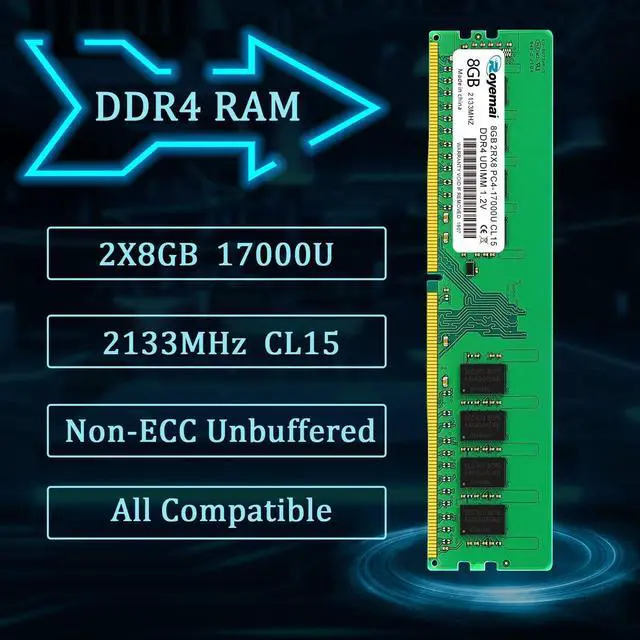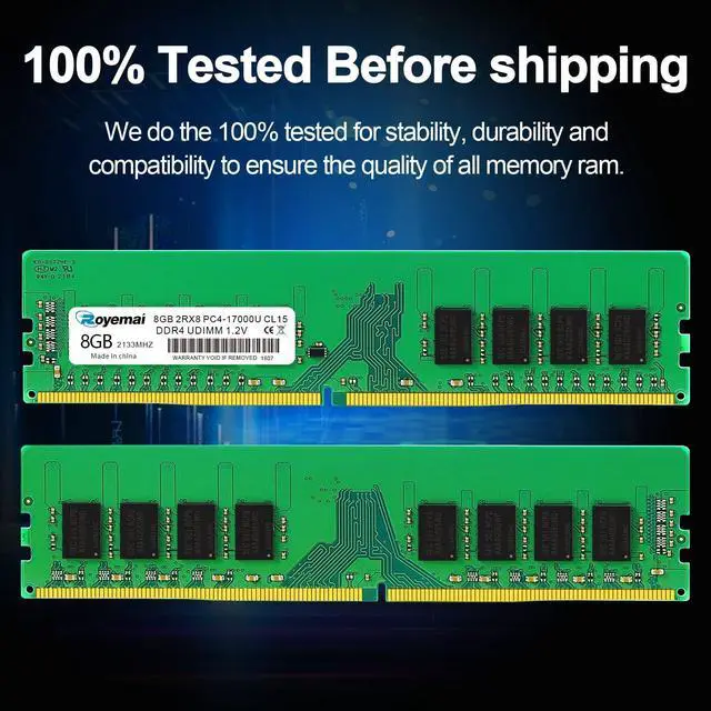 16GB DDR4 17000U PC4 2133 2X8GB UDIMM, DDR4-2133MHz PC4-17000 CL15 2Rx8 1.2V Non-ECC 288 Pin Desktop Memory Module RamPlease Kindly Note: In case the RAM cannot fit your computer, please ensure the parameters before you purchase, such as the RAM model, RAM slot and maximum memory of your computer. High StabilityHigh-quality originals, strict process. All chips from large brands, through strict testing and screening testing. Advanced electroplating process is applied on the connecting finger will improve corrosion resistance and electrical conductivity. After Long-time burn in test and temperature tolerance test aiming at major system platform, it approves that ROYEMAI memory owns high stability and performance. Faster and SmootherROYEMAI RAM is designed to help your system run faster and smoother, one of the easiest ways to improve your system's performance. Load programs faster, increase responsiveness, run data-intensive applications easily and increase your desktop's multitasking capabilities. After install larger memory, computer will respond noticeably faster, particularly with lots of windows open. High CompatibilityTo make sure itll be compatible with Intel, AMD System well, ROYEMAI RAM has been through compatibility testing with all popular brands of motherboards. Test results show that memory is able to offer superior performance and high stability required during long time operation for any brand computer.