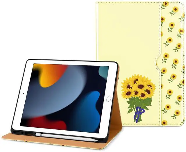DTTO for iPad 9th/8th/7th Generation 10.2 Inch Case 2021/2020/2019, Premium Leather Business Folio Stand Cover with Apple Pencil Holder - Auto Wake/Sleep and Multiple Viewing Angles, Sunflower