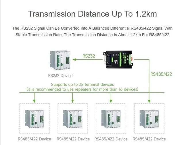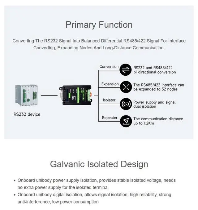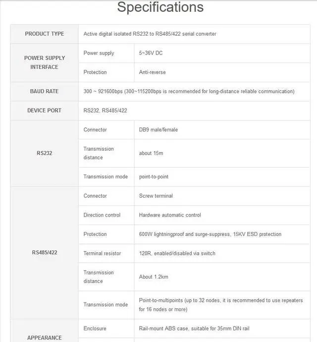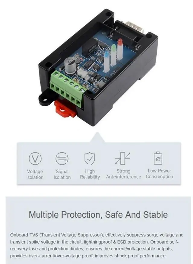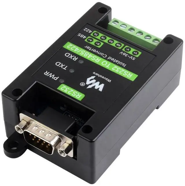 IntroductionRS232 TO RS485/422 (RS232 DB9 Male Port), an industrial grade RS232 to RS485/422 isolated converter, boasts industrial grade rail-mount case design and protection circuits such as the built-in power isolation, ADI magnetical isolation, and TVS diode. It is easy to operate RS232 TO RS485/422 as it features zero-delay automatic transmission conversion, faster communication speed, stability, reliability, and safety, which is applicable for scenarios with high communication requirements. FeaturesOnboard SP3232EEN and SP485EEN chips. Fast communication, stable and reliable, better compatibilityStable transmission at the rate of 300~921600bpsOnboard unibody power supply isolation, provides stable isolated voltage, needs no extra power supply for the isolated terminalOnboard unibody digital isolation, allows signal isolation, high reliability, strong anti-interference, low power consumptionOnboard TVS (Transient Voltage Suppressor), effectively suppress surge voltage and transient spike voltage in the circuit, lightningproof & anti-electrostaticOnboard self-recovery fuse and protection diodes, ensures the current/voltage stable outputs, provides over-current/over-voltage proof, improves shock proof performanceOnboard 15KV ESD isolation protection and 600W lightningproof & anti-surge protectionOnboard 120R terminal resistor on the RS485/RS422 interface, disable by default, configurable by jumperOnboard power supply screw terminal, allows 5V~36V DC wide range input3 LEDs for indicating the power and transceiver statusIndustrial rail-mount ABS case design, small in size, easy to install, and cost-effective.