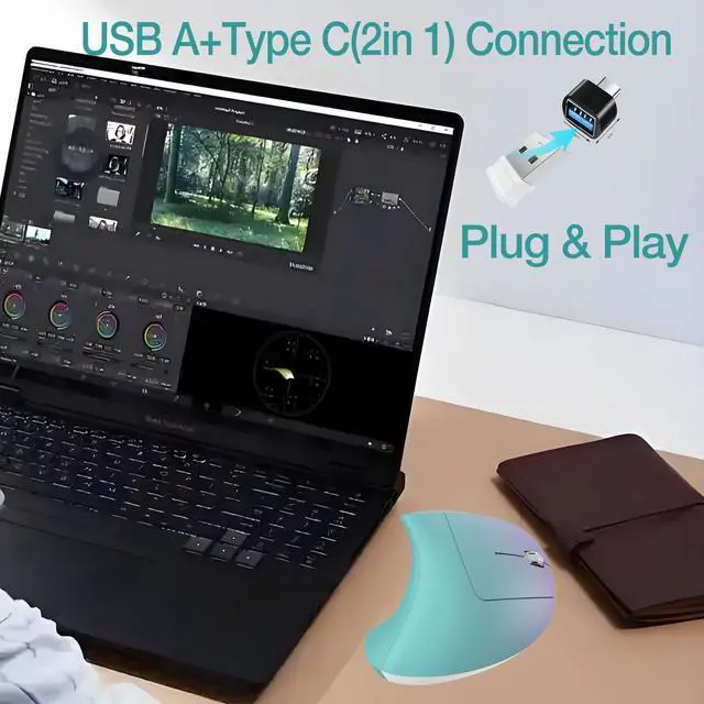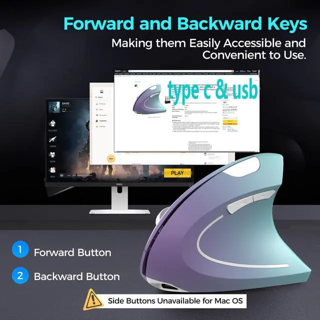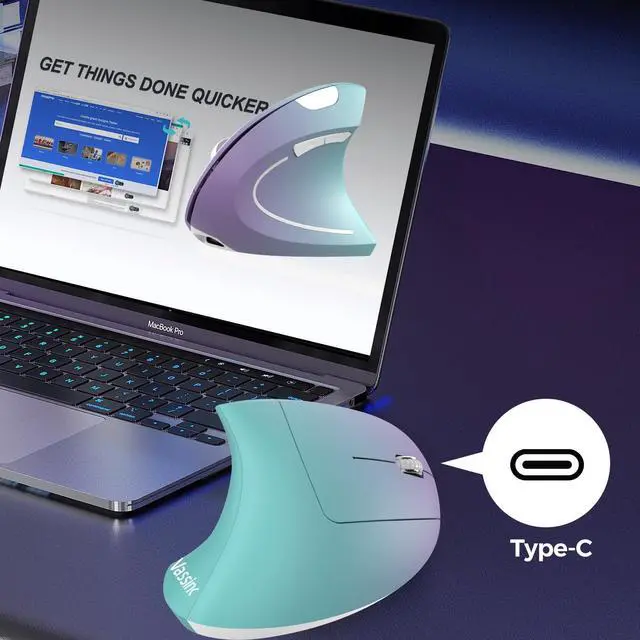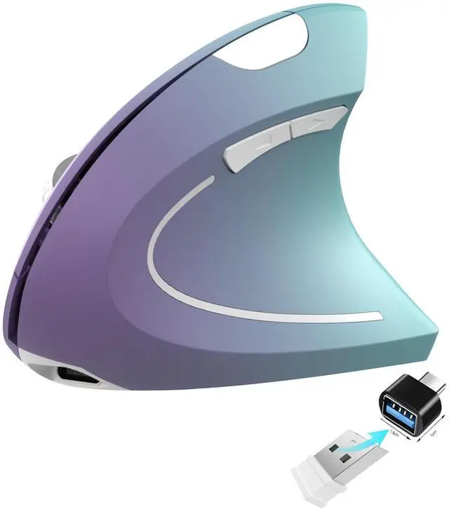 Vertical ergonomic design ergonomic mouse adopts a scientific vertical design, with an angle of 58 degrees to the desktop. It fits the curvature of the palm very well, encourages a healthy and neutral "handshake" posture, and provides ultimate comfort. Promote smoother movement, reduce stress on the wrist and arm, and relieve wrist muscle fatigue and pain. ^^ Multiple connection methodsThis vertical ergonomic mouse uses connection methods: 2.4GH z USB A+USB C, It is very suitable for devices without USB ports. When using the 2.4GH z USB connection mode, you only need to plug in the USB receiver to quickly connect. It is equipped with both USB A and USB C receivers. When there is only a Type C interface on the device, plug the USB C receiver into the USB A receiver, and then plug it into the Type C interface of the device to use it. ^^ Multifunction and Convenient Advanced "Page Back" and "Page Forward" functionality buttons provide convenience when web page browsing. This ergonomic mouse with 800 / 1200 / 1600 DPI Levels -- Easily adjusts the sensitivity of the optical vertical mouse. The left and right buttons are designed with a low-noise quiet click that won't disturb others ^^ Rechargeable MouseThe wireless vertical mouse is rechargeable and does not require additional batteries, saving the cost of purchasing batteries. it can be used for 1-3 months, After a full charge, depending on usage habits and daily usage time. If it is idle for ten minutes, the mouse will enter standby mode to extend the battery life.