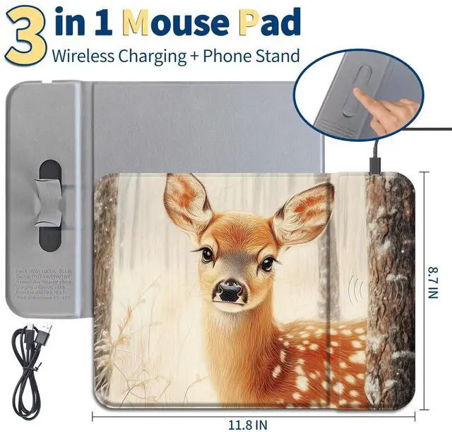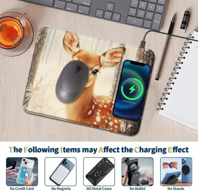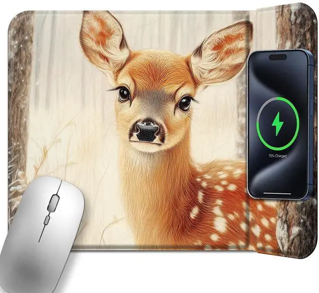 Fast 15W Wireless Charging Mouse Pad,11.8x8.7 Inch Non-Slip PU Leather Desk Mat,Compatible with Qi-Certified Devices for Office and Gaming Desk,Cute Deer Forest