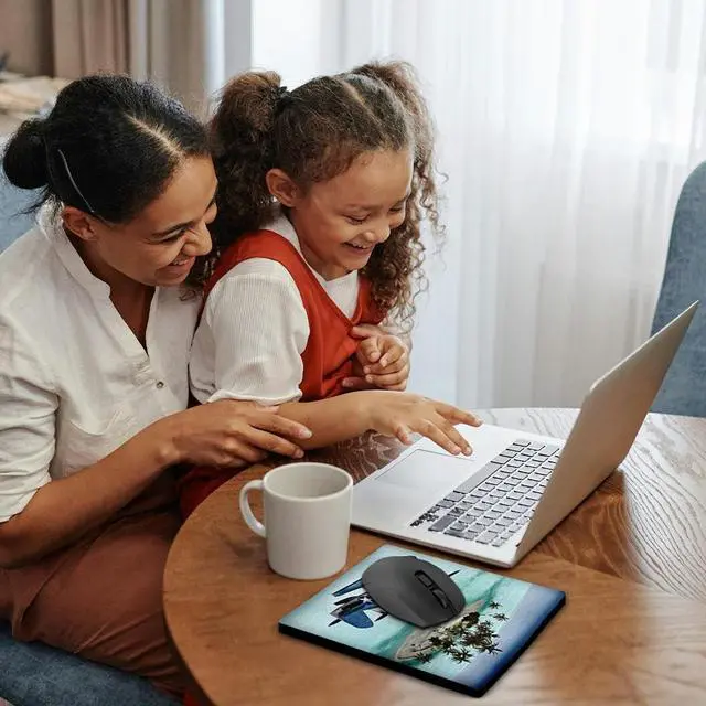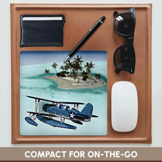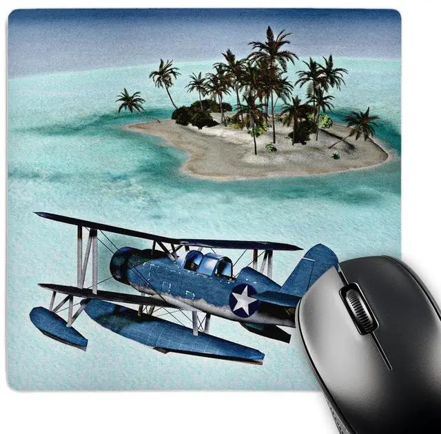 Military Seaplane flying over a Pacific Island Mouse Pad is 8" x 8" x. 25" and is made of heavy-duty recycled rubber. Matte finish image will not fade or peel. Machine washable using a mild detergent and air dry.
