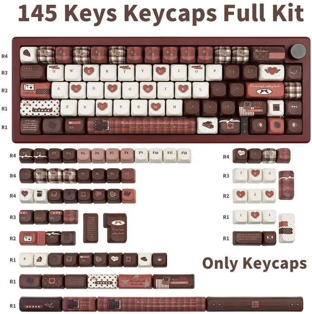 Widely Compatible: 145 keys keycaps can be used for most cherry MX switch mechanical keyboards and any keys with "+"Switches, it can fit for 61/64/68/75/84/87/96/98/104/108 mechanical keyboard UK US ANIS ISO Layout4.