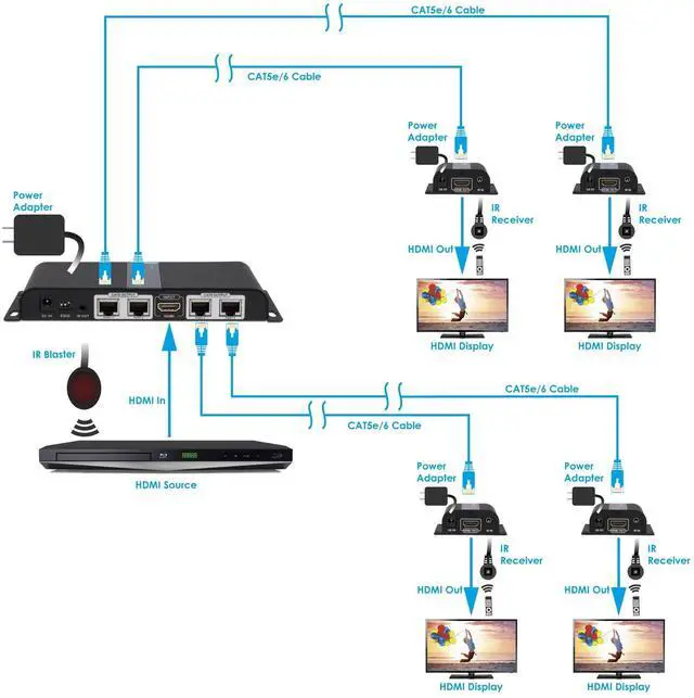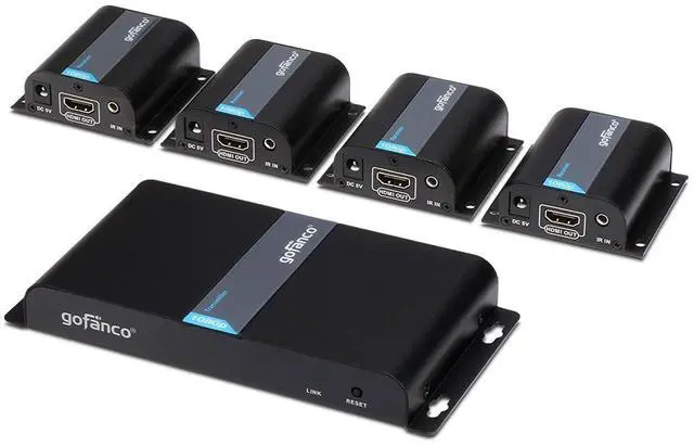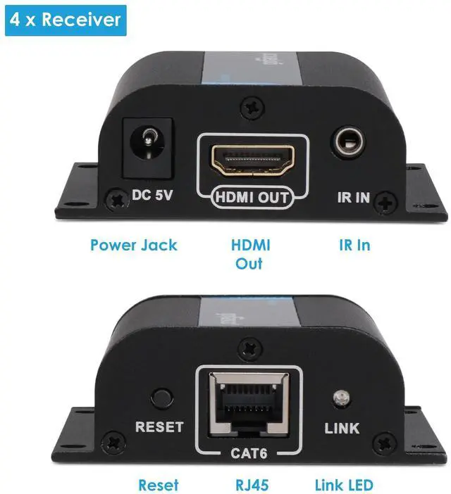 1x4 HDMI SPLITTER EXTENDER KIT Includes 1 Transmitter and 4 Receivers. Extend and distribute 1 HDMI source to 4 HDMI displays over CAT5e/6/7 simultaneously.
