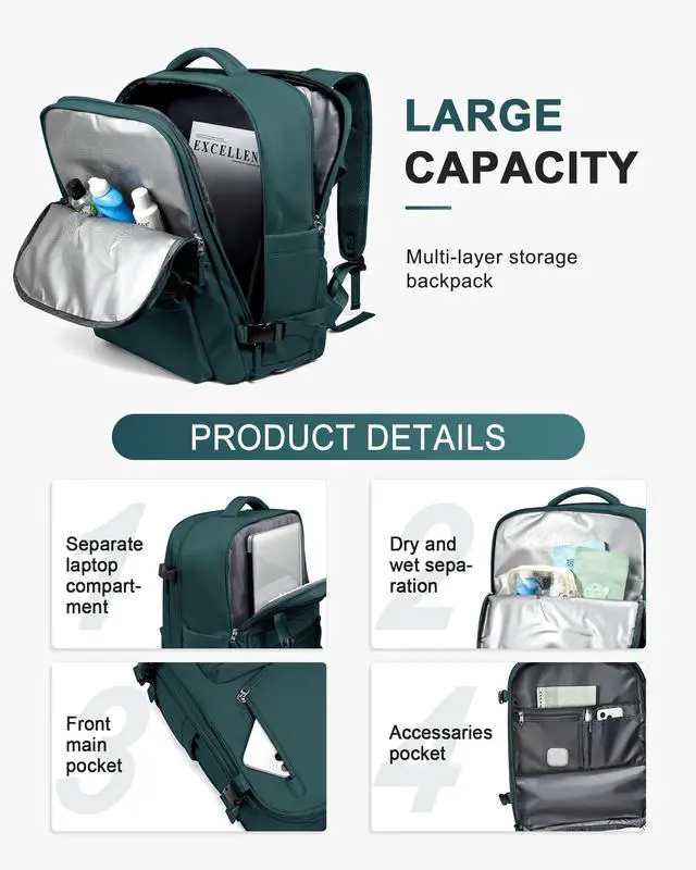 Great travel backpack for women This backpack is made of durable waterproof polyester, good air permeability and heat dissipation with two padded shoulder straps, offers lightweight carrying and strength reinforcement, relieve shoulder pressure, and maintain cool when wearing for a long time. And it's hard, solid, and doesn't fade. ^^ Separate Shoe Compartment Design & Wet Bag Main pocket x 2, laptop compartment x 2 (suitable for 13 "tablet and 14" laptop respectively), The wet bag is made of high density water resistant material can help you to separate dry items and wet items, if you have wet clothes or towel, you can put it in the wet bag.